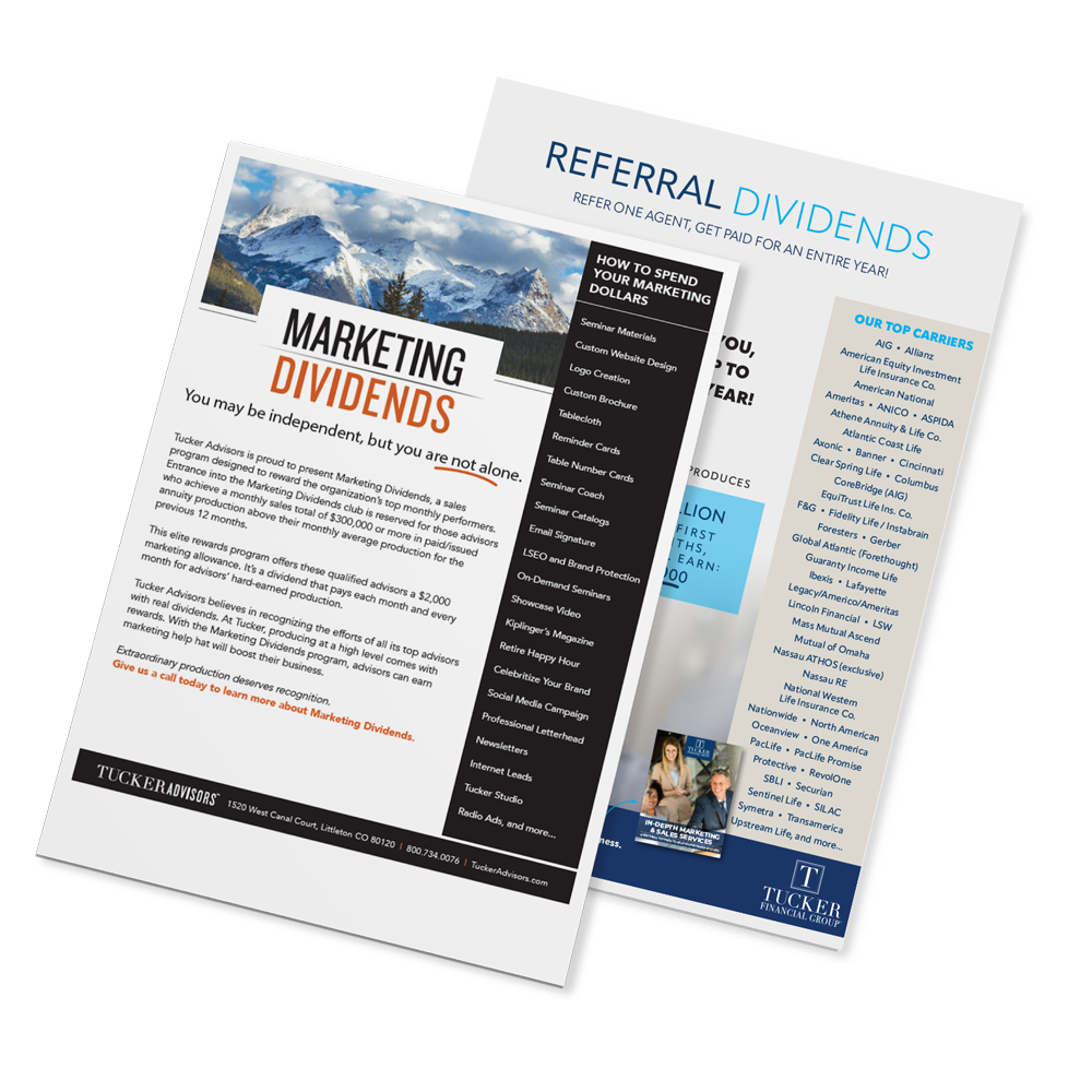 Tucker Advisors believes in recognizing the efforts of all its top advisors with real dividends. At Tucker, producing at a high level comes with rewards. With the Marketing Dividends program, advisors can earn marketing help that will boost their business.
